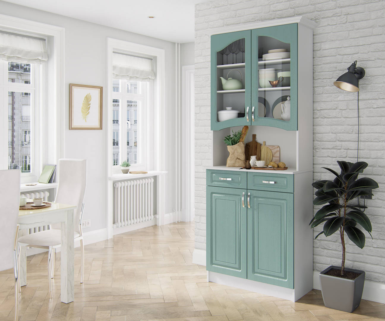 Буфет Прованс-08Размеры: 2150х800х430 (ВхШхГ). Возможные цвета фасадов: Клен бирюза, Клен серый, Клен белый, Клен крем.