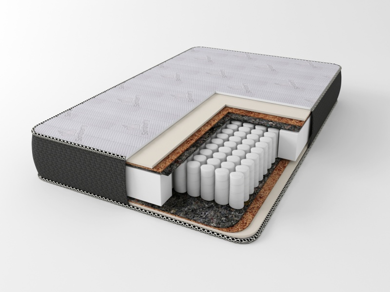 - Высокая эластичная пена 20 мм + Кокосовая плита 10 мм с двух сторон/ Защитный слой Блок Sonberry 2XL высотой 200 мм, 512 пружин на 1 спальное место/ Усиление по периметру/ Эксклюзивная нестеганая черная ткань Boх